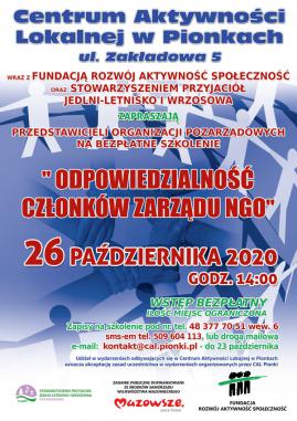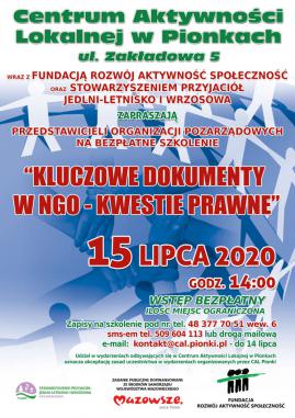 Centrum Aktywności Lokalnej w Pionkach wraz z Fundacją Rozwój Aktywność Społeczność oraz Stowarzyszeniem Przyjaciół Jedlni-Letnisko i Wrzosowa zapraszają przedstawicieli organizacji pozarządowych na bezpłatne szkolenie pt. „Kluczowe dokumenty w NGO – kwestie prawne”, 15 lipca 2020, godzina 14:00, Wstęp bezpłatny, Ilość miejsc ograniczona, Zapisy na szkolenie: drogą mailową na adres e-mail: kontakt@cal.pionki.pl, telefonicznie tel. 48 377 70 51 wew.6, sms-em tel. 509 604 113 do 14 lipca 2020. Szkolenie poprowadzi prawnik, a omówione zostaną następujące zagadnienia: – W jaki sposób prawidłowo sporządzić lub zmienić statut organizacji pozarządowej , – Wyciąg z KRS, – Polityka rachunkowości, – Polityka bezpieczeństwa danych osobowych, – Uchwała, protokoły, oświadczenia, – Umowy, – Wewnętrzna polityka bezpieczeństwa finansowego (dla fundacji i stowarzyszeń przyjmujących gotówkę powyżej 15 tys. Euro), – Dokumenty związane z rachunkiem bankowym, – Dokumenty związane z siedzibą organizacji, – Regulaminy, deklaracje np. członkowskie i inne ważne dokumenty wewnętrzne w organizacji. Prosimy uczestników szkolenia o zapoznanie się z zasadami uczestnictwa w wydarzeniach organizowanych przez CAL Pionki na czas epidemii COVID – 19. Poniżej link z zasadami, Kliknij tutaj