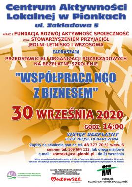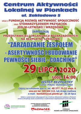 Centrum Aktywności Lokalnej w Pionkach wraz z Fundacją Rozwój Aktywność Społeczność oraz Stowarzyszeniem Przyjaciół Jedlni-Letnisko i Wrzosowa zapraszają przedstawicieli organizacji pozarządowych na bezpłatne szkolenie pt.” Zarządzanie zespołem – asertywność i budowanie pewności siebie – coaching”. 29 lipca 2020, godzina 14:00, Wstęp bezpłatny, Ilość miejsc ograniczona, Zapisy na szkolenie: drogą mailową na adres e-mail:kontakt@cal.pionki.pl, telefonicznie tel. 48 377 70 51 wew.6, sms-em tel. 509 604 113 do 28 lipca 2020. Plan szkolenia: Zarządzanie – modele NGO – podejście coachingowe,- Myślenie strategiczne w oparciu o trendy, czyli jak wyprzedzać zmiany, Praktyczne narzędzia zarządzania zmianą, Relacje a kultura organizacyjna – Budowanie pewności siebie – Obrona przed manipulacją, Rozwój i samorozwój w NGO – asertywność. Zapraszamy!!! Prosimy uczestników szkolenia o zapoznanie się z zasadami uczestnictwa w wydarzeniach organizowanych przez CAL Pionki na czas epidemii COVID – 19. Poniżej link z zasadami, Kliknij tutaj