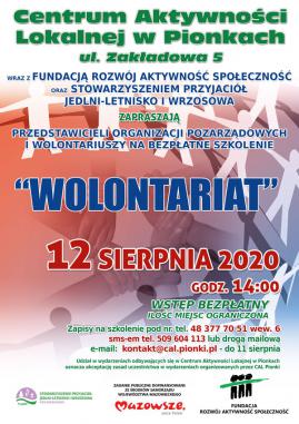 Centrum Aktywności Lokalnej w Pionkach wraz z Fundacją Rozwój Aktywność Społeczność oraz Stowarzyszeniem Przyjaciół Jedlni-Letnisko i Wrzosowa zapraszają przedstawicieli organizacji pozarządowych i wolontariuszy na bezpłatne szkolenie pt. „Wolontariat”, 12 sierpnia 2020, godzina 14:00, Wstęp bezpłatny, Ilość miejsc ograniczona, Zapisy na szkolenie: drogą mailową na adres e-mail: kontakt@cal.pionki.pl, telefonicznie tel. 48 377 70 51 wew.6, sms-em tel. 509 604 113 do 11 sierpnia 2020. Zapraszamy!!! Prosimy uczestników szkolenia o zapoznanie się z zasadami uczestnictwa w wydarzeniach organizowanych przez CAL Pionki na czas epidemii COVID – 19. Poniżej link z zasadami, Kliknij tutaj