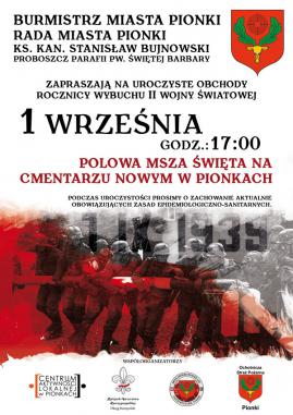Na tegoroczne obchody rocznicy wybuchu II wojny światowej zapraszają: Burmistrz Miasta Pionki – Robert Kowalczyk, Rada Miasta Pionki, Proboszcz Parafii pw. Świętej Barbary – Ks. Kan. Stanisław Bujnowski. Uroczystości rozpoczną się 1 września o godz. 17:00 na Cmentarzu Nowym w Pionkach. Przedstawiciele lokalnych władz, związki i stowarzyszenia kombatanckie oraz zaproszeni goście złożą wieńce i kwiaty na „Górce Zasłużonych”, gdzie pochowani są harcerze i partyzanci polegli podczas II wojny światowej. Następnie odprawiona zostanie Polowa Msza Święta. Chcielibyśmy zachęcić wszystkich mieszkańców, aby w tym dniu włączyli się do obchodów zarówno poprzez uczestnictwo w uroczystości na Cmentarzu Nowym, jak też przez uhonorowanie ofiar II wojny światowej przez zapalenie symbolicznego znicza lub złożenia kwiatów w miejscach pamięci znajdujących się w naszym mieście. Mamy nadzieję, że hołd poległym w czasie II wojny światowej odda wielu mieszkańców naszego miasta, a pamięć o tych tragicznych wydarzeniach będzie przekazywana młodszym pokoleniom. Podczas uroczystości prosimy o zachowanie aktualnie obowiązujących zasad epidemiologiczno – sanitarnych.