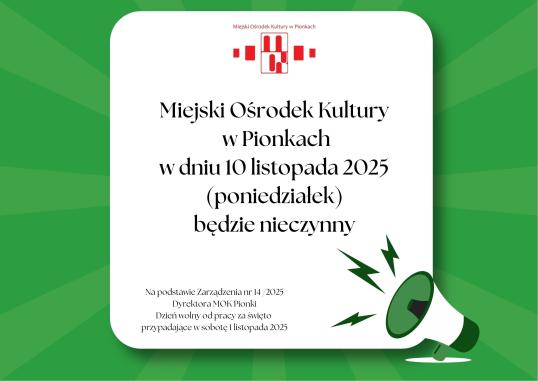 Szanowni Państwo,informujemy, że 10 listopada 2025 r. (poniedziałek) Miejski Ośrodek Kultury w Pionkach będzie zamknięty.Dzień ten został wyznaczony jako dzień […]